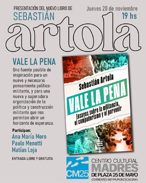 Están todos invitados! Mabel Temporelli inaugura en nuestra casa su muestra Hubo un tiempo. Habrá visitas guiadas para el público en general en días y horarios prefijados. Para escuelas o grupos, se puede concertar visitas guiadas especiales. El jueves 20 de noviembre a las 19hs se presentará el libro Vale la pena de Sebastián Artola. La obra intenta ser una fuente de inspiración para un nuevo y necesario pensamiento político-militante en los difíciles tiempos en que nos toca vivir. Estará presente el autor, y participarán además Ana María Moro, Pautlo Menotti y Matías Loja. La entrada es libre y gratuita.