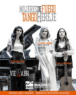 El viernes 10 de abril a las 21 hs. se presentará en nuestra casa el espectáculo Mujeres de Fuego/Tango hereje, a cargo de Yanina Bolognese en piano y arreglos, Alejandra Zambrini en canto y relatos, y Camila Montenegro en guitarra. También se podrá adquirir bebidas y algo para comer. Los esperamos.